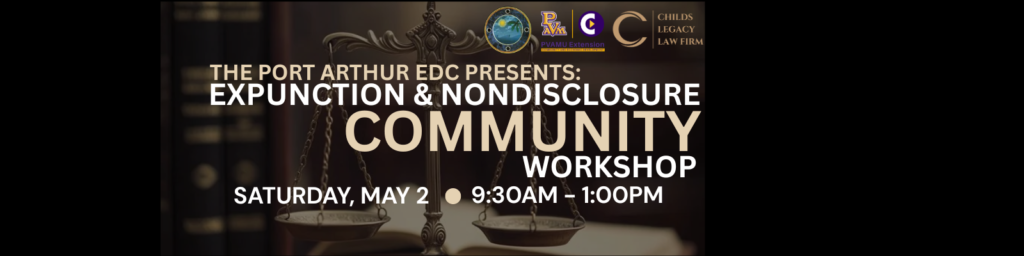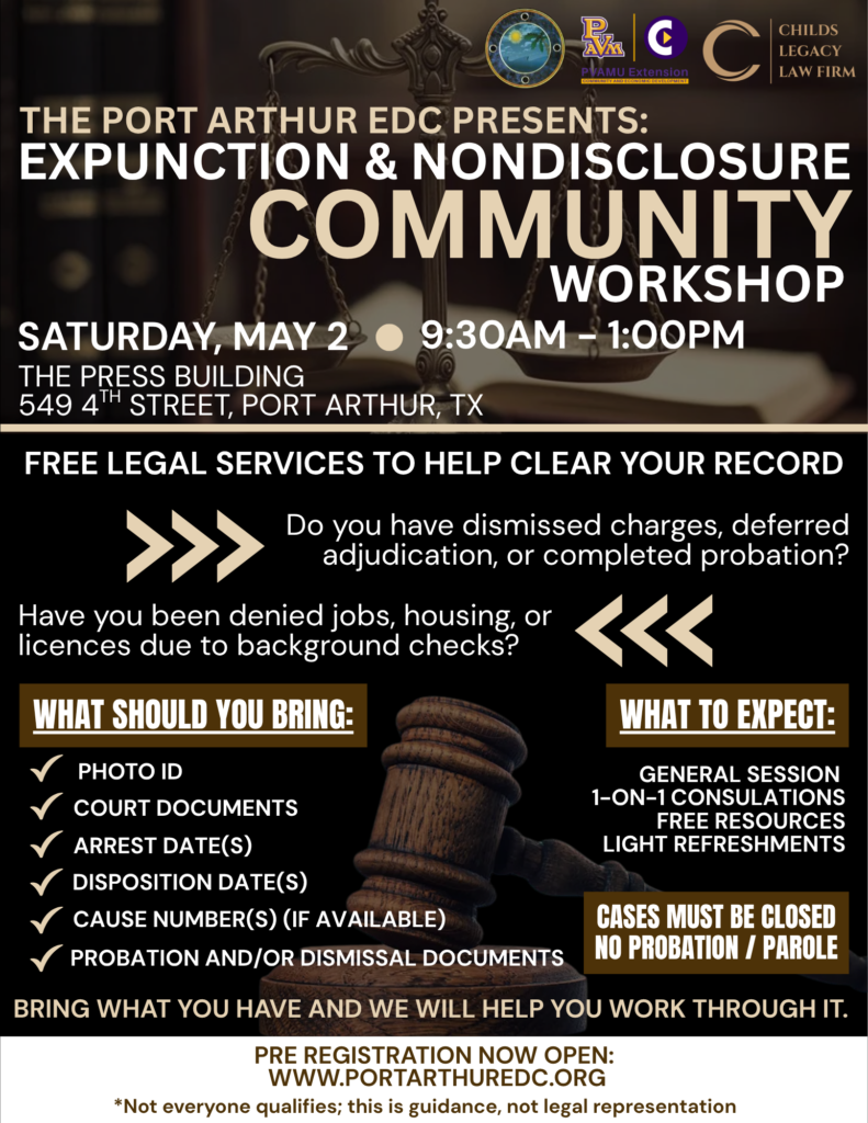 The Port Arthur EDC’s Expunction and Nondisclosure Community Workshop is designed to help individuals better understand their legal options for clearing or sealing their criminal records under Texas law. Many people are unaware that they may qualify for an expunction or nondisclosure, even if their case was dismissed or did not result in a conviction.