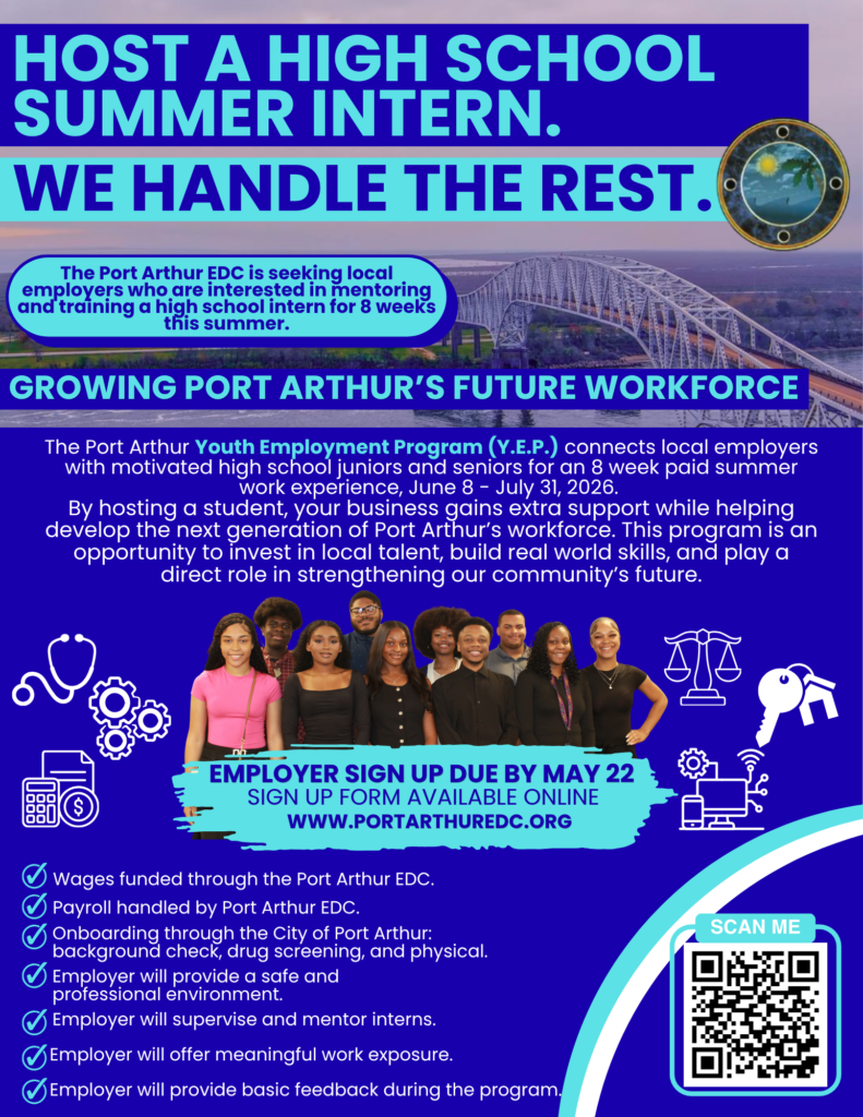 The Port Arthur EDC is seeking local employers who would are interested in mentoring and training a high school intern for 8 weeks this summer. The Port Arthur Youth Employment Program (Y.E.P.) connects local employers with motivated high school juniors and seniors. By hosting a student, your business gains extra support while helping develop the next generation of Port Arthur’s workforce. This program is an opportunity to invest in local talent, build real world skills, and play a direct role in strengthening our community’s future.